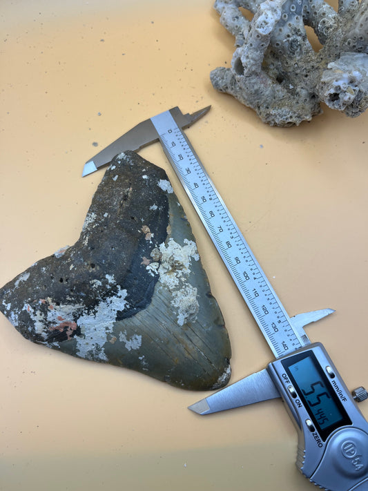 5.6” Megalodon Tooth from a 56’ prehistoric shark! Great size, nice serrations, nice bourlette