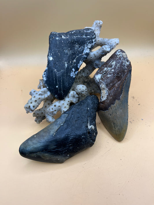 3 x 4.0”-4.4” megalodon teeth partials. Hand found scuba diving off Nc. From massive 40’ or bigger 2-20 million year old sharks!