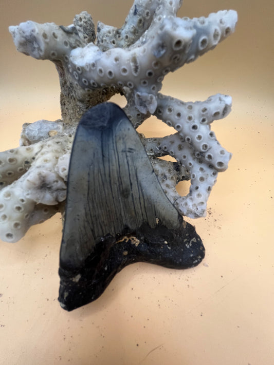 5.2” meg tooth from a 52’ shark, special iron oxide deposits on back