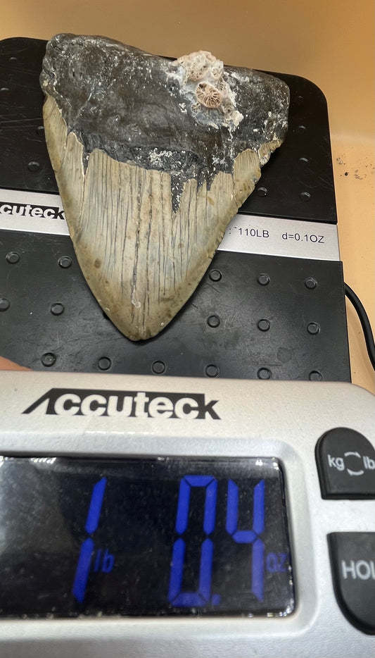6.06” giant 1 lb megalodon tooth, scuba diver found off NC