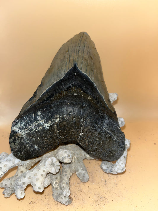 5.3” megalodon tooth from 53’ shark, found in 100’ water