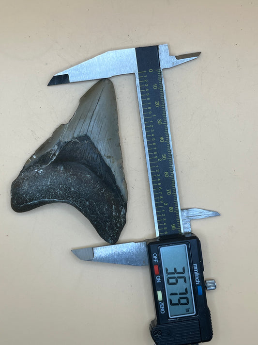 3.6” Megalodon Tooth from a 36’ prehistoric shark! Great size, nice serrations, nice bourlette.
