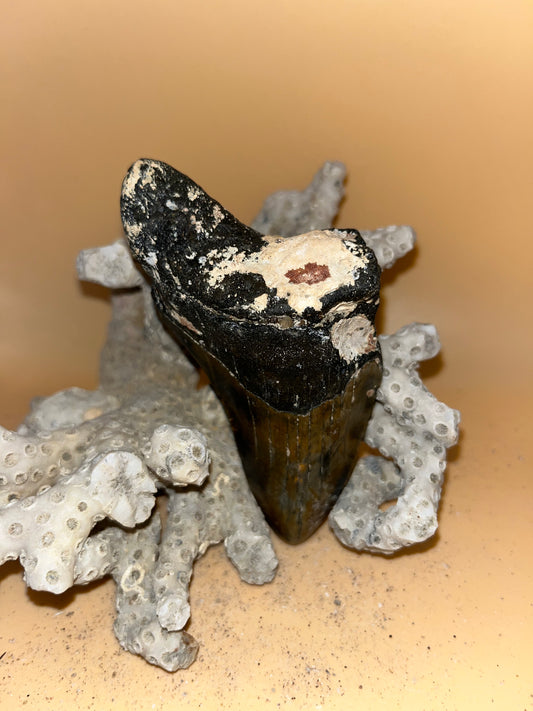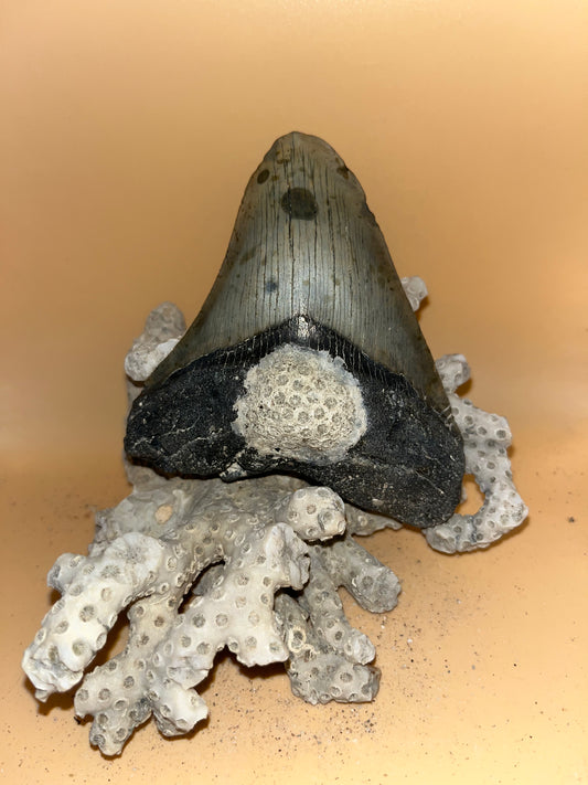 4.6” Megalodon Tooth from a 46’ prehistoric shark! Unique pink coral on root! Pathological folds!