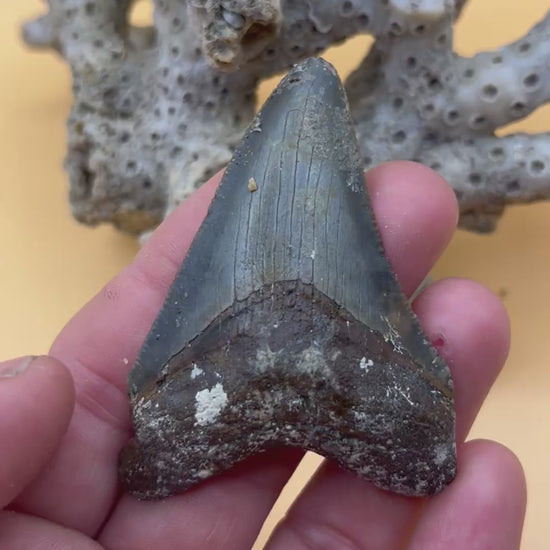 2.5” Megalodon Tooth from a 25’ prehistoric shark! Great size, nice bourlette & serrations. All teeth are hand recovered in 100+ feet of water by scuba divers off North Carolina. You’re the second human to hold this tooth! Check out Megalodon Tooth Huntress on social medias to see find videos. Tooth only; coral, calipers etc not included with tooth.