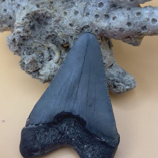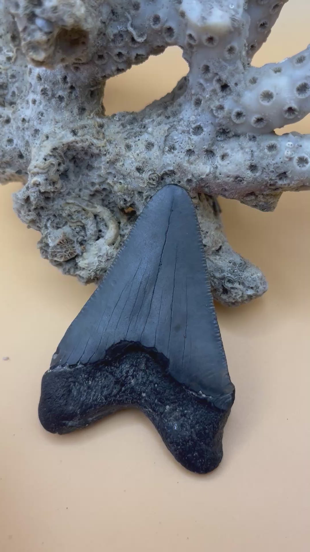 2.6” Megalodon Tooth from a 26’ prehistoric shark! Great size, nice bourlette & serrations. All teeth are hand recovered in 100+ feet of water by scuba divers off North Carolina. You’re the second human to hold this tooth! Check out Megalodon Tooth Huntress on social medias to see find videos. Tooth only; coral, calipers etc not included with tooth.