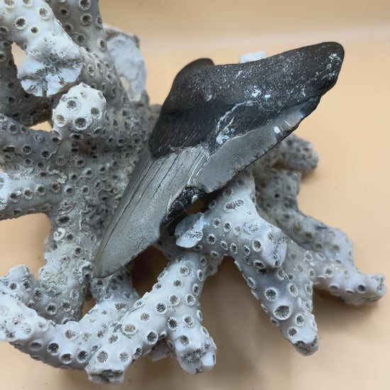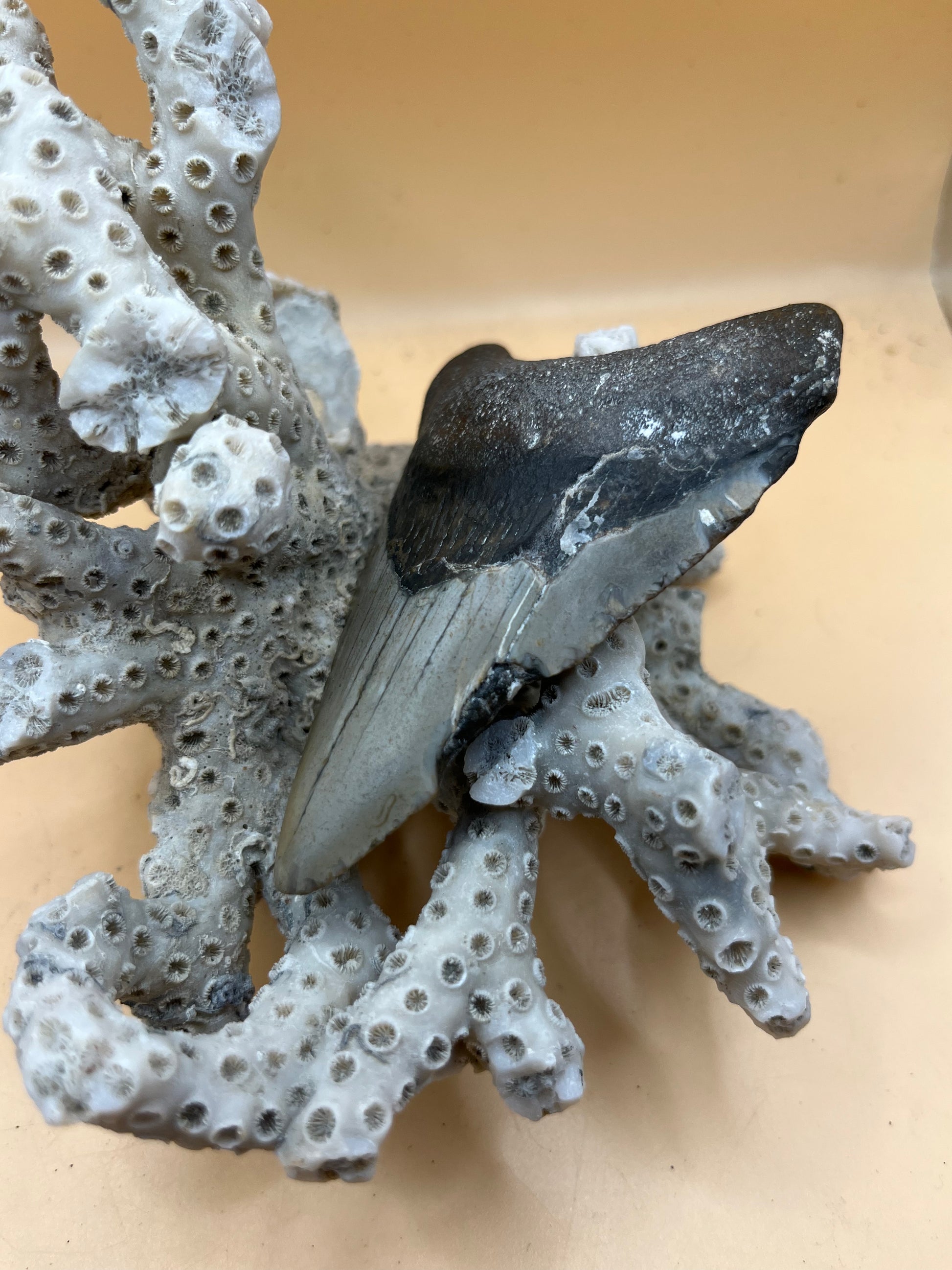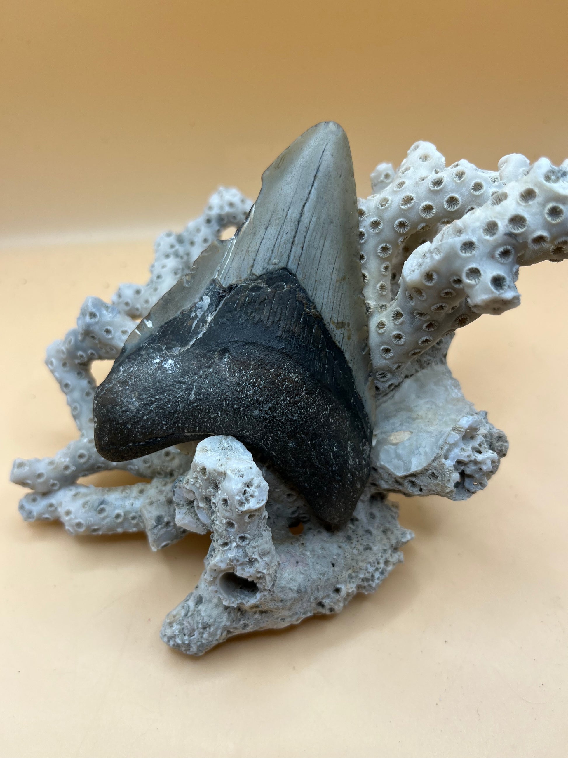 3.6” Megalodon Tooth from a 36’ prehistoric shark! Great size, nice serrations, nice bourlette. All teeth are hand recovered in 100+ feet of water by scuba divers off North Carolina. You’re the second human to hold this tooth! Check out Megalodon Tooth Huntress on social medias to see find videos. Tooth only; coral, calipers etc not included with tooth.