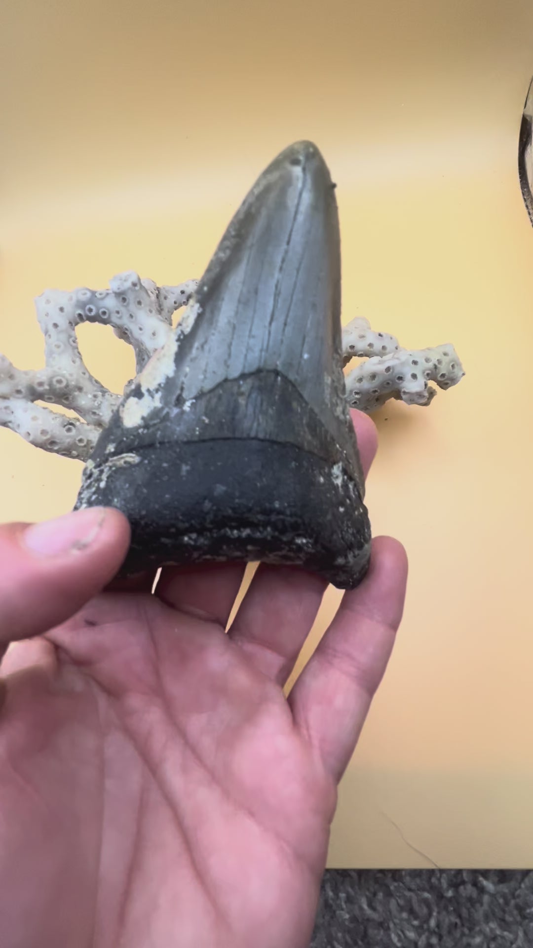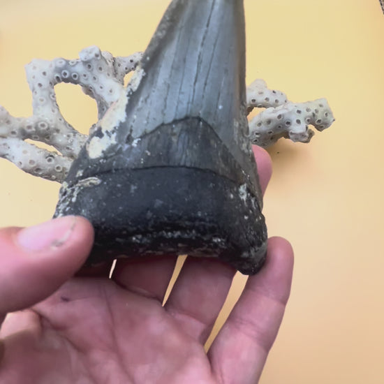 4.0” Megalodon Tooth from a 40’ prehistoric shark! Great size, nice bourlette & serrations. All teeth are hand recovered in 100+ feet of water by scuba divers off North Carolina. You’re the second human to hold this tooth! Check out Megalodon Tooth Huntress on social medias to see find videos. Tooth only; coral, calipers etc not included with tooth.