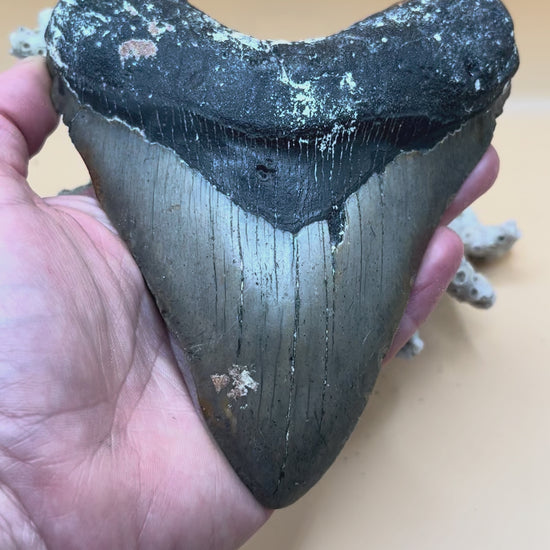 5.2” Megalodon Tooth from a 52’ prehistoric shark! Great size, nice bourlette & serrations. All teeth are hand recovered in 100+ feet of water by scuba divers off North Carolina. You’re the second human to hold this tooth! Check out Megalodon Tooth Huntress on social medias to see find videos. Tooth only; coral, calipers etc not included with tooth.