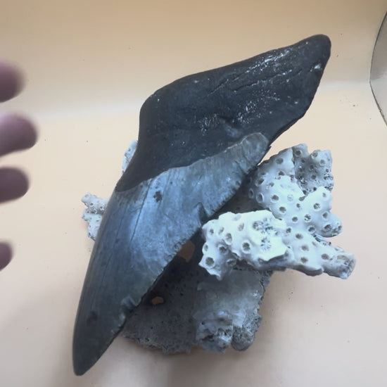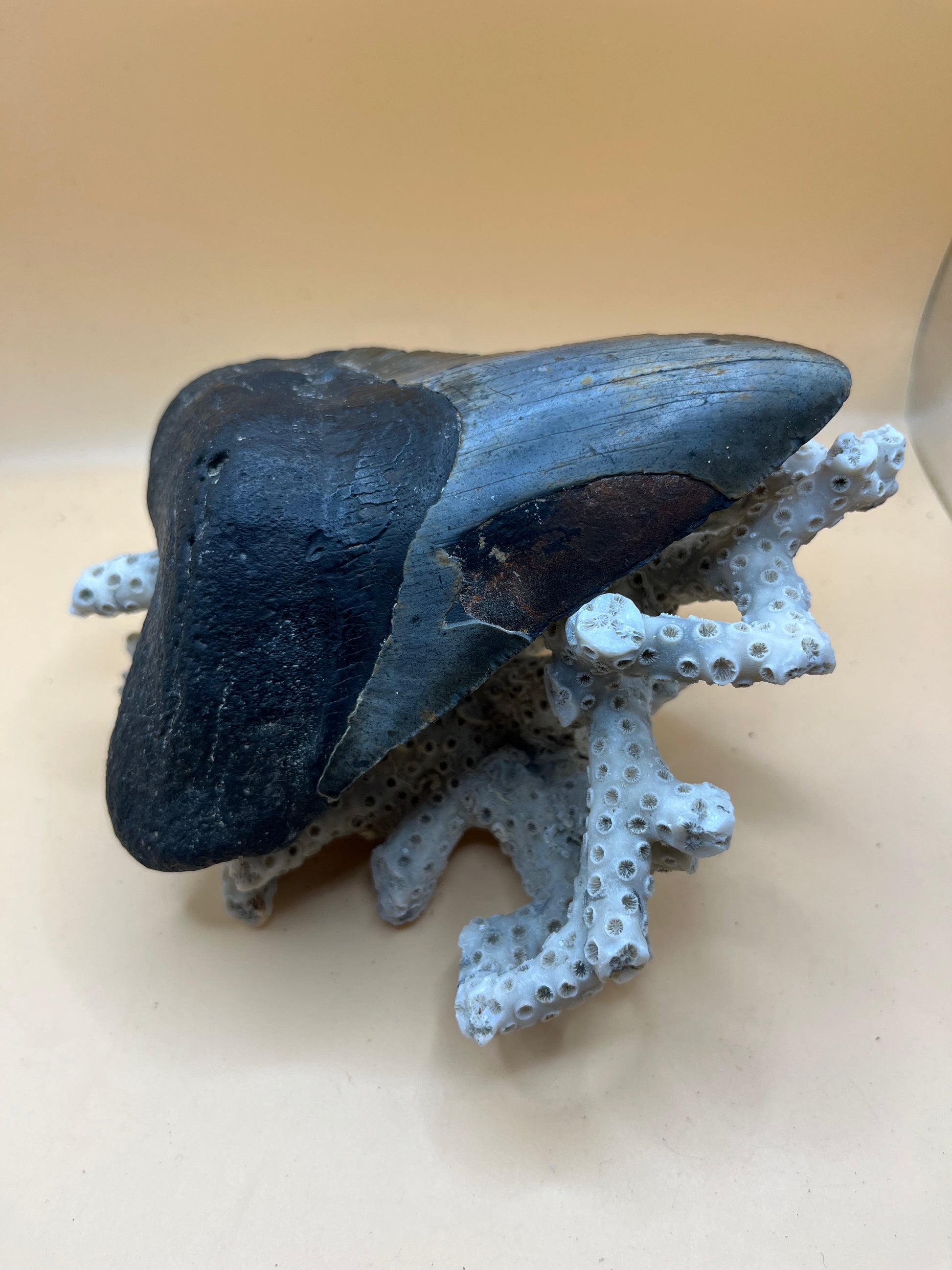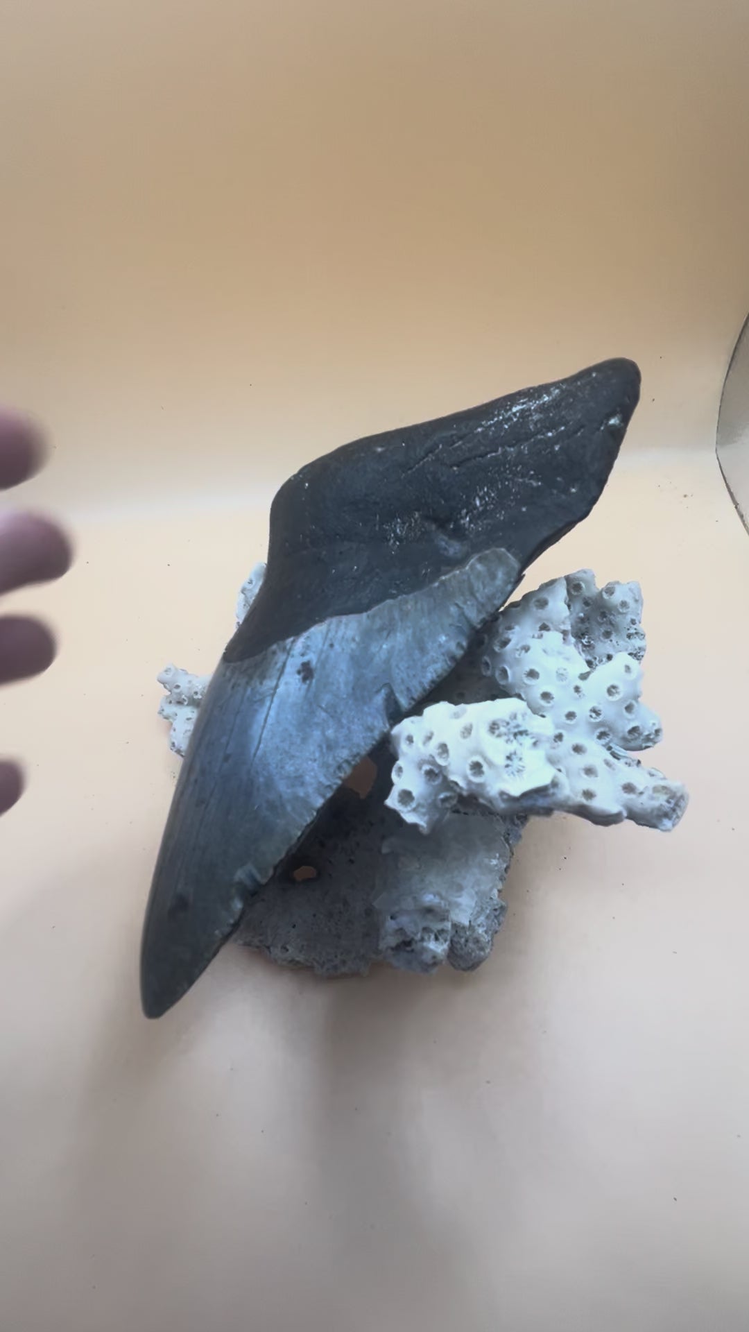 5.7” Megalodon Tooth from a 57’ prehistoric shark! Great size, nice serrations, nice bourlette. All teeth are hand recovered in 100+ feet of water by scuba divers off North Carolina. You’re the second human to hold this tooth! Check out Megalodon Tooth Huntress on social medias to see find videos. Tooth only; coral, calipers etc not included with tooth.