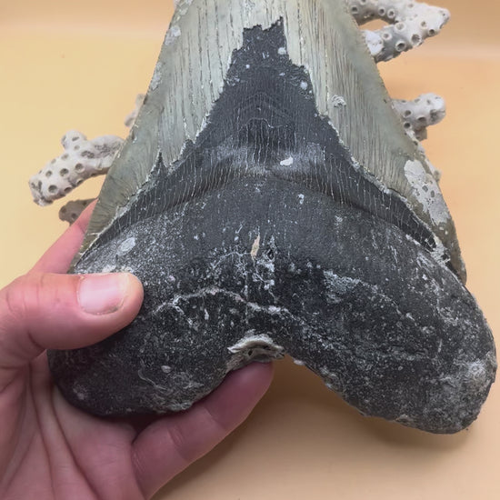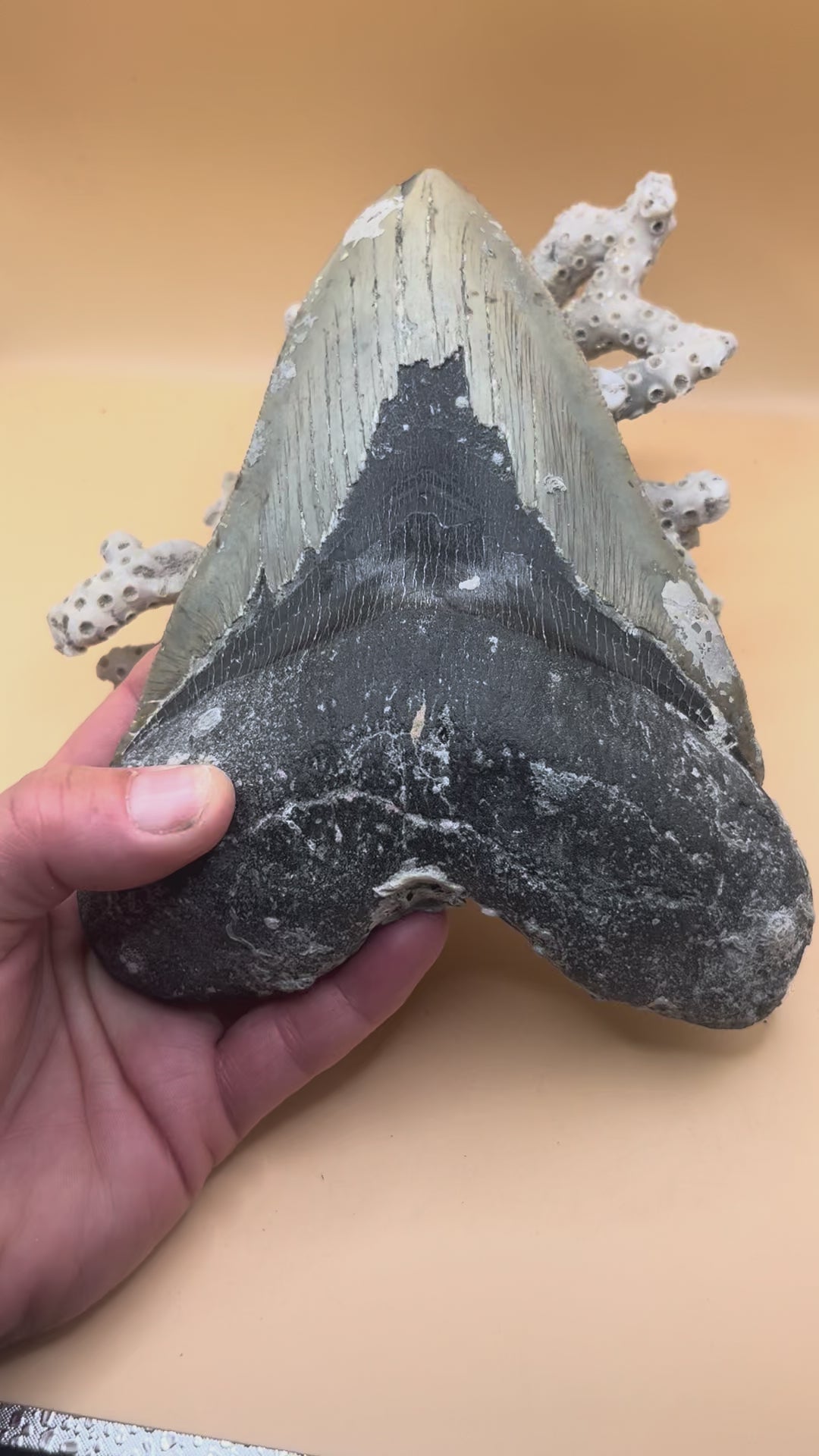 6.5” x 4.9” Megalodon Tooth from a 65’ prehistoric shark! Great size, nice serrations, nice bourlette. All teeth are hand recovered in 100+ feet of water by scuba divers off North Carolina. You’re the second human to hold this tooth! Check out Megalodon Tooth Huntress on social medias to see find videos. Tooth only; coral, calipers etc not included with tooth.