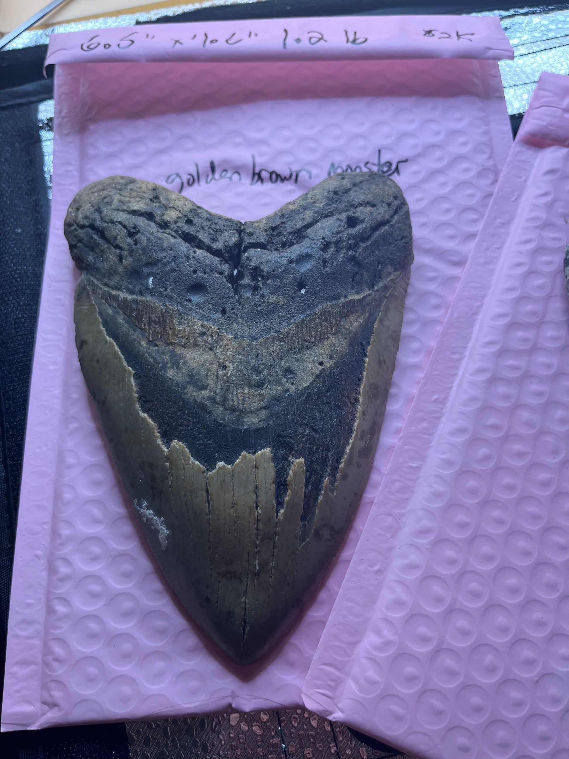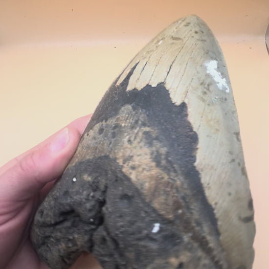 6.5” x 4.6” Megalodon Tooth from a 65’ prehistoric shark! Great size, nice serrations, nice bourlette. All teeth are hand recovered in 100+ feet of water by scuba divers off North Carolina. You’re the second human to hold this tooth! Check out Megalodon Tooth Huntress on social medias to see find videos. Tooth only; coral, calipers etc not included with tooth.