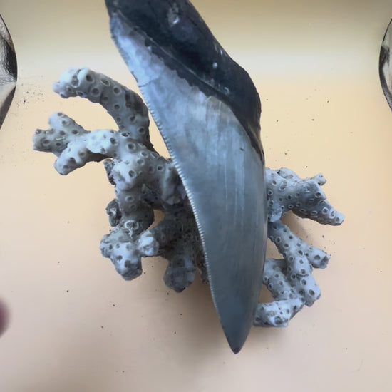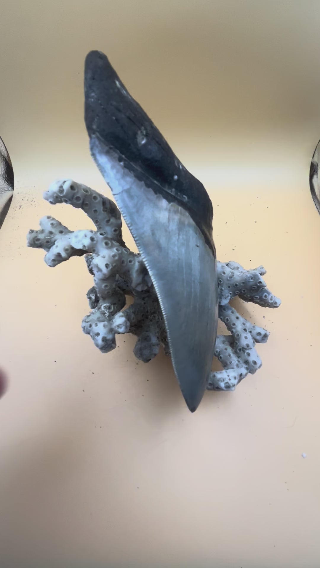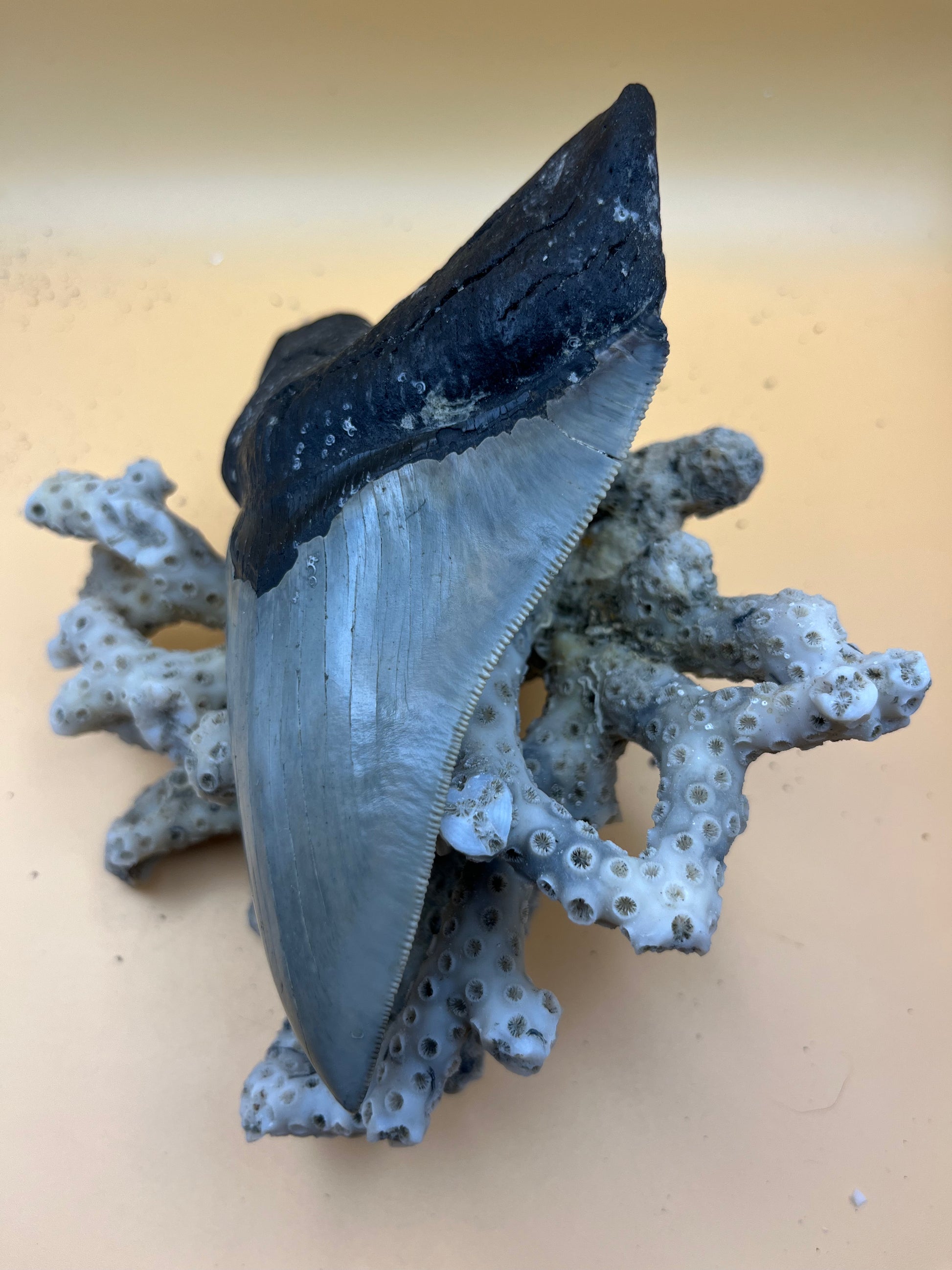 5.7” Megalodon Tooth from a 57’ prehistoric shark! Great size, nice bourlette & serrations. All teeth are hand recovered in 100+ feet of water by scuba divers off North Carolina. You’re the second human to hold this tooth! Check out Megalodon Tooth Huntress on social medias to see find videos. Tooth only; coral, calipers etc not included with tooth.