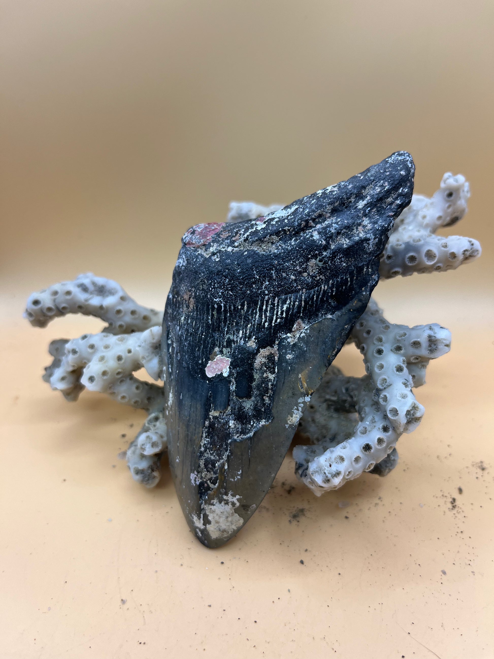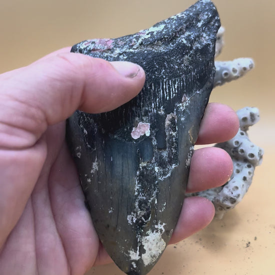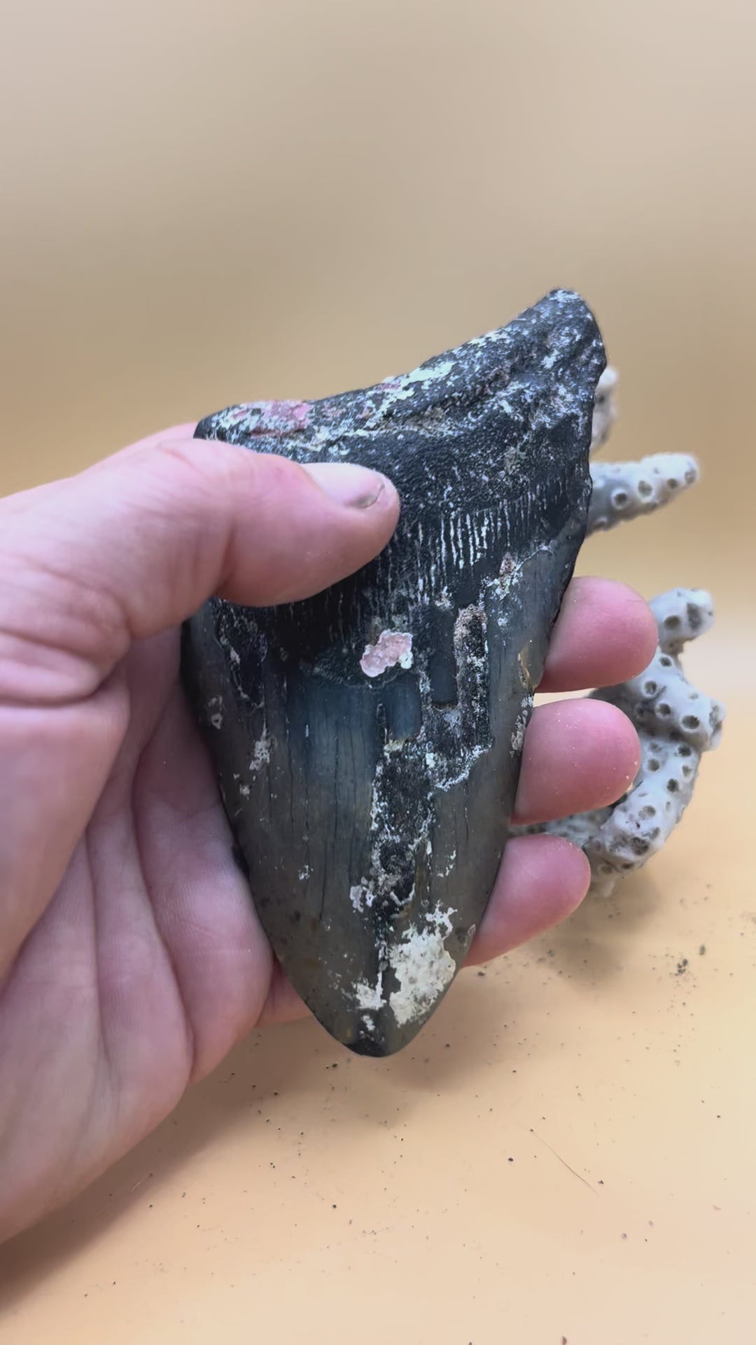 4.7” Megalodon Tooth from a 47’ prehistoric shark! Great size, missing part of left root. All teeth are hand recovered in 100+ feet of water by scuba divers off North Carolina. You’re the second human to hold this tooth! Check out Megalodon Tooth Huntress on social medias to see find videos. Tooth only; coral, calipers etc not included with tooth.